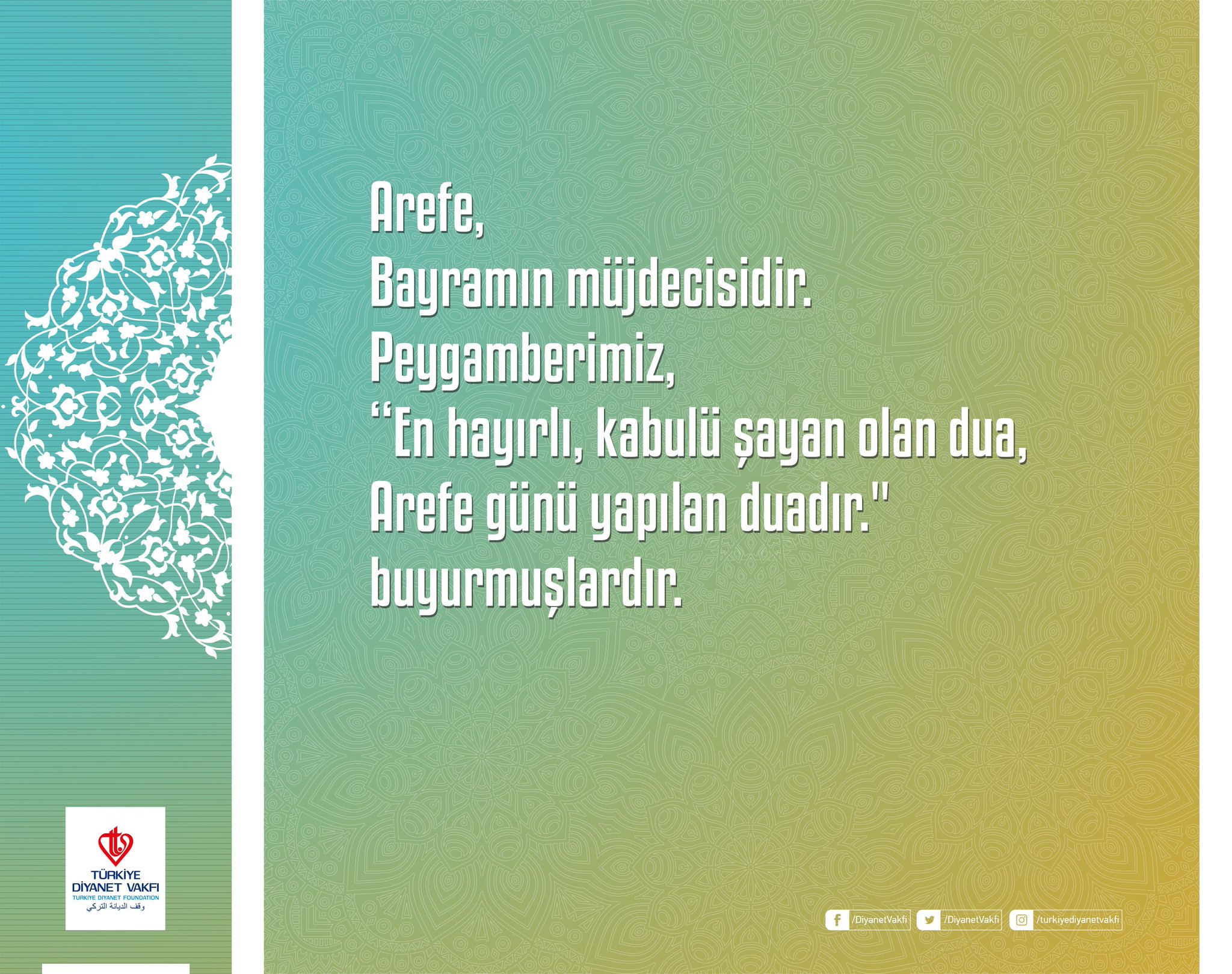 La ilahe illellahü vahdehü la şerike leh lehül. Arefe günü çokça istiğfar etmeli ve günahtan kaçınmalıdır arefe gününe hürmet edin. Muhammed arife gecesinde şu duâyı okuyana yaradanın istediğini vereceğini beyân buyurmuştur. Lem yelid velam yuled.