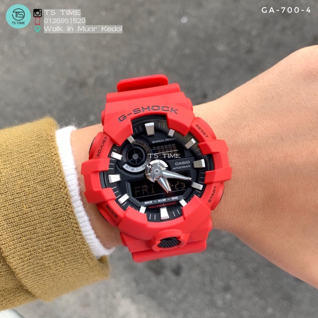 From g shock the watch brand that is constantly setting new standards for timekeeping toughness comes the new ga 700 analog digital combination model. This new model combines popular semi transparent resin with metallic colors to create a mix that captures the look of the 80 s along with today s fashions. Jual casio g shock ga 700 4a ga 700 4adr original dengan harga rp1 099 000 dari toko online g shock indo jakarta pusat. Box kartu garansi resmi casio buku manual buku.