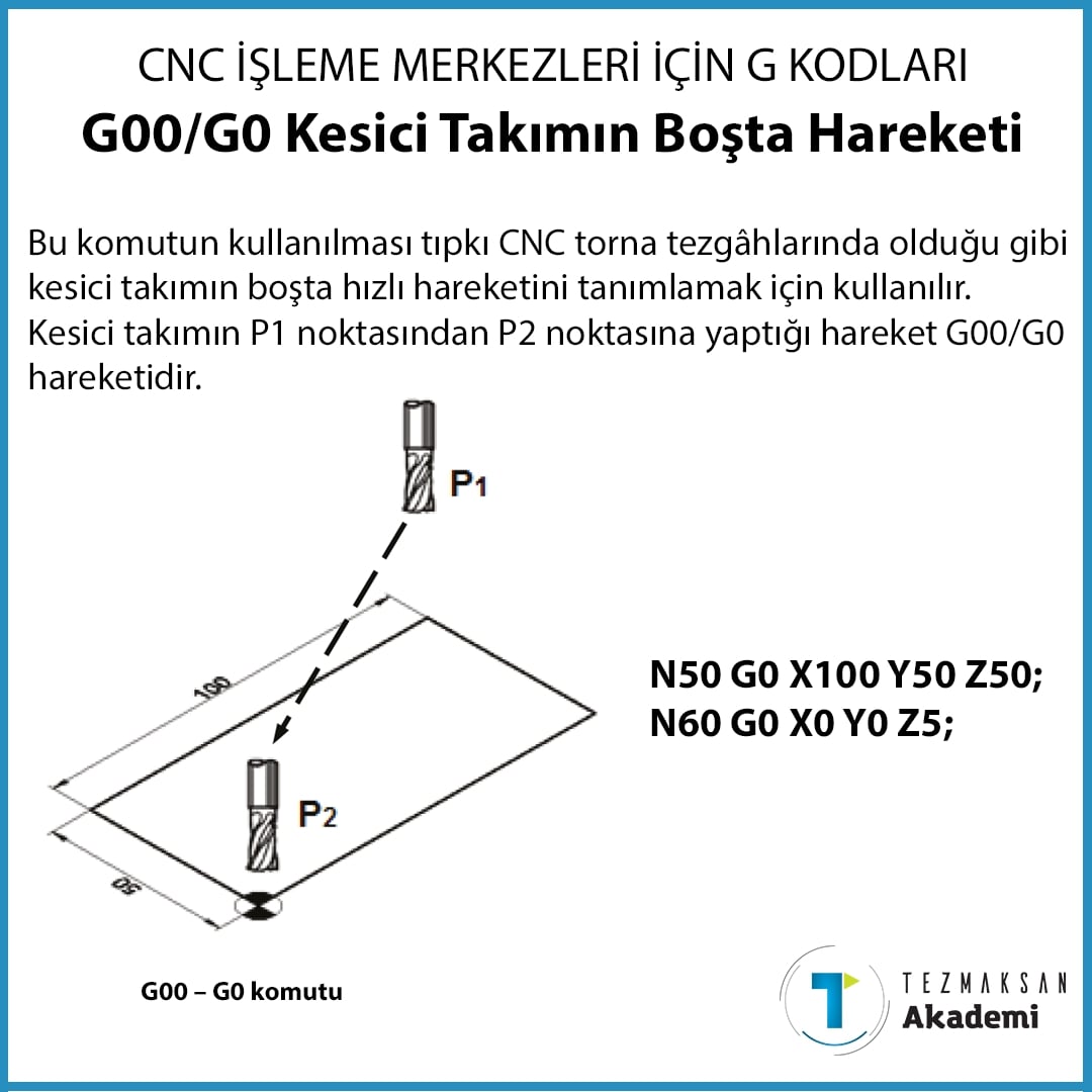 Boşta hızlı ilerleme kesici takımın talaş kaldırmadan boştaki hızlı hareketi. G02 saatin dönüş yönünde dairesel hareket. G01 istenilen ilerleme hızında doğrusal hareket. çoğu yerde kodların yanlış şekilde anlamı verilen ya da tam karşılığı verilmemiş anlamsız çevirilere rast gelebilirsiniz.