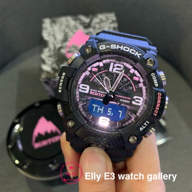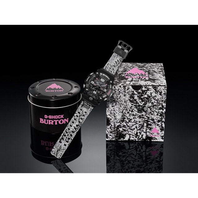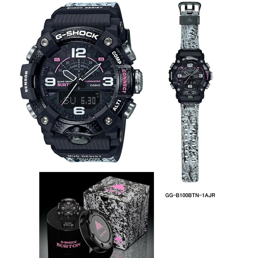 Burton snowboards and casio are teaming up to release their third g shock collaboration watch. The resin bands have a snow camouflage pattern and the dial and bezel feature pink accents. Other than the orange display accents and a digital style camouflage pattern on the bands the dark forest like gg 1000btn 1a mudmaster is a departure from the last burton collaboration the snow inspired gw 9400btj 8 rangeman the gg 1000btn 1a has a black bezel with olive green bezel lettering and. The limited edition watch fuses the ultra ruggedness of the mudmaster gg b100 with a style inspired by snowboarding in the mountains.