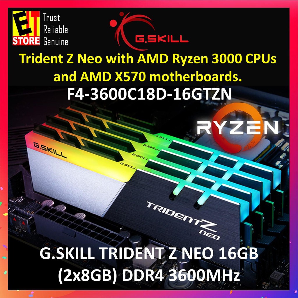 The trident z neo features the same fan favorite profile with a new bold two tone color scheme and specifications aimed squarely at maximizing ryzen 3000 performance. This item g skill 32gb trident z neo ddr4 3600mhz pc4 28800 cl14 rgb quad channel kit 4x 8gb g skill f4 3600c16q 32gtzr 32 gb 8 gb x 4 trident z rgb series ddr4 3600 mhz dual channel memory kit black with full length rgb led light bar. G skill tridentz neo ddr4 3600 mhz 2x32gb i haz a lot of memory. Flare x for amd fortis for amd ripjaws v.