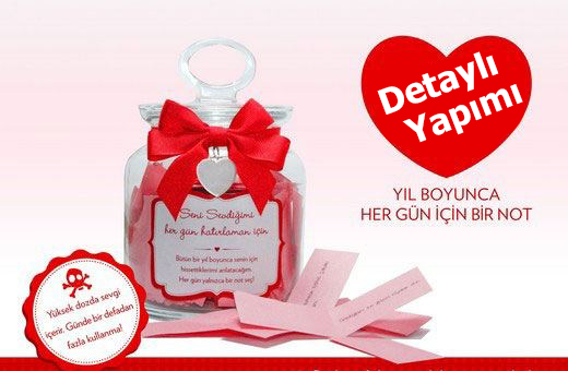 Sevgilinize duyduğunuz aşkı bir gün değil tam bir yıl boyunca yaşatacak olan aşk dolu kavanoz karşınızda. R nonu bir gün değil her gün sevdiğinizi anlatmanın farklı bir yolu. Aşk kavanozu her güne bir mesaj kavanozu özel tasarım r nşimdi özel tasarım çok şık kutusunda sizlerle buluşturuyoruz. Fakat dediğim gibi 365 adet olması sürprizinizin büyüsünü kat.