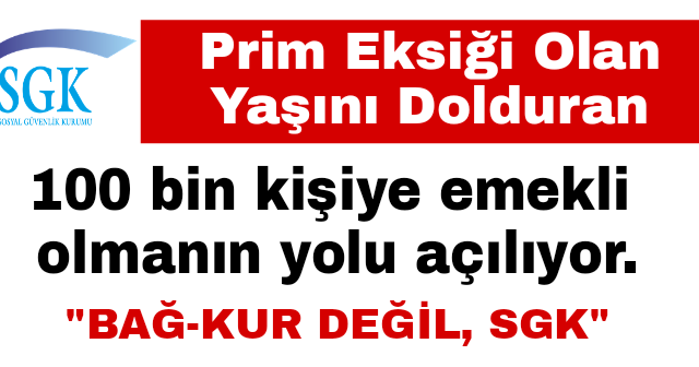 Bu konunun tartışıldığı ancak bakanlıklar arasında uzlaşma sağlanması halinde hayata geçebileceği belirtilmişti. Prim günü şartına takılan 100 bine yakın kişi bulunuyor. Prim günü eksiği olanlara da emeklilik yolunun açılması gündemde. Prim günü şartına takılan 100 bine yakın kişi bulunuyor.