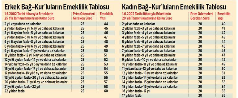 25 tam yıl 9000 gün prim ödeme ve 57 yaş şartlarına tabi olursunuz. Sene 1993 sigorta baslangic yilim 3268 günüm doldu 1977 doğumluyum 2 çocuğum var suan calismiyorum ne zaman ve ne sekilde emekli olurum. Ama 3600 günüm yeni doldu. Bağ kur prim günlerimi ssk ya aktardım.